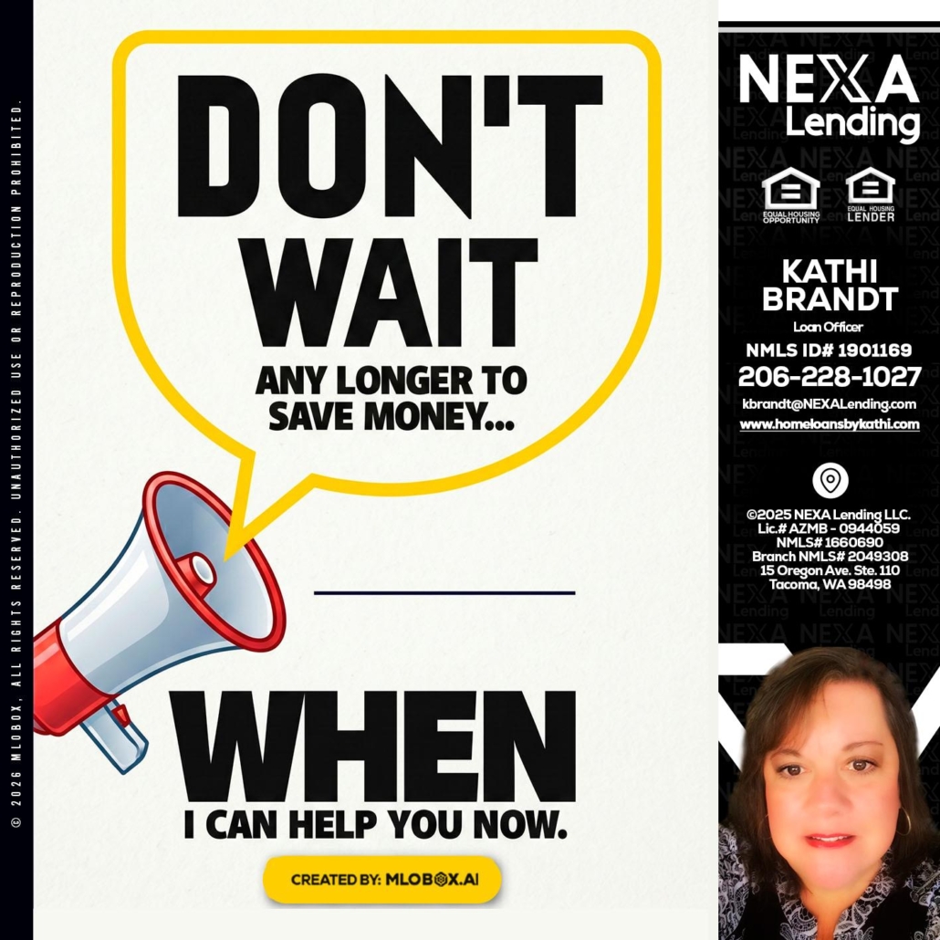 DONT WAIT - Kathi Brandt -Mortgage Loan OriginatorHi, my name is Kathi Brandt. I’m a Loan Officer with NEXA Lending LLC., offering personalized mortgage solutions, fast customized quotes, great rates and service with integrity.