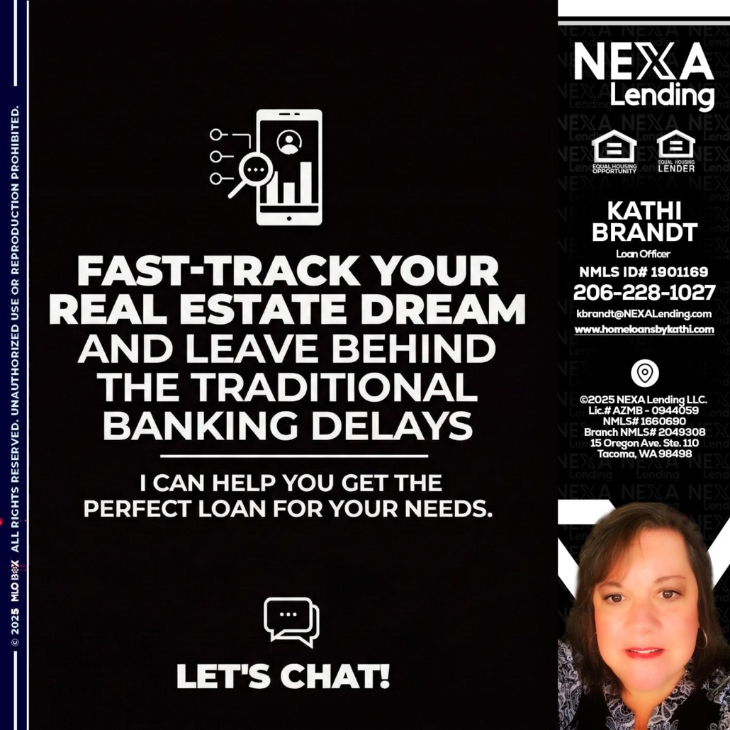 FAST TRACK - Kathi Brandt -Mortgage Loan OriginatorHi, my name is Kathi Brandt. I’m a Loan Officer with NEXA Lending LLC., offering personalized mortgage solutions, fast customized quotes, great rates and service with integrity.