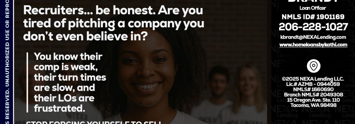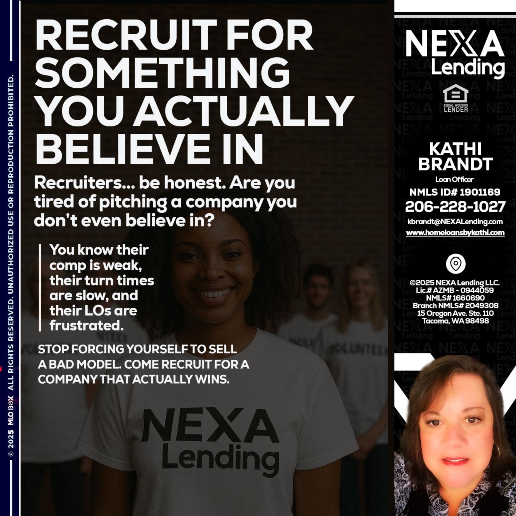 Hi, my name is Kathi Brandt. I’m a Loan Officer with NEXA Mortgage LLC., offering personalized mortgage solutions, fast customized quotes, great rates and service with integrity.