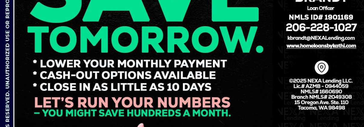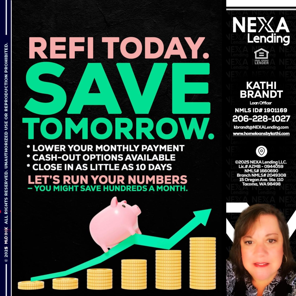 REFI TODAY SAVE TOMORROW - Kathi Brandt -Mortgage Loan OriginatorHi, my name is Kathi Brandt. I’m a Loan Officer with NEXA Mortgage LLC., offering personalized mortgage solutions, fast customized quotes, great rates and service with integrity.